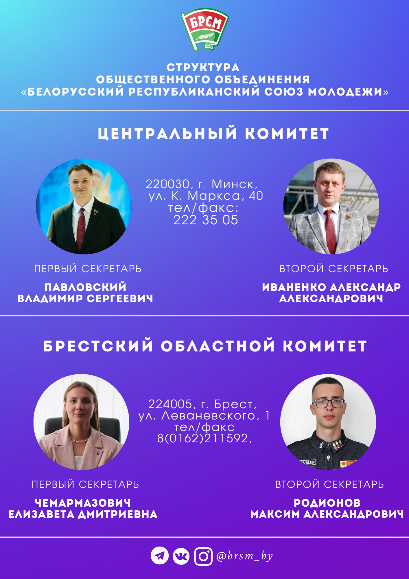 Структура Общественного объединения «Белорусский республиканский союз молодежи»: Секретарь первичной организации — Макар Ульяна Юрьевна 225420, г. Барановичи, ул. Федько 16Б, рабочий телефон: 66-54-07.